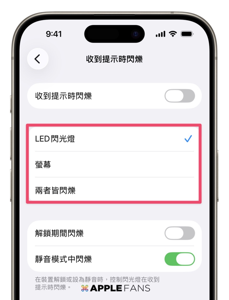 設定位置:「設定」 > 「輔助使用」> 找到音訊與視覺裡的「收到提示時閃爍 LED」,就可以調整。