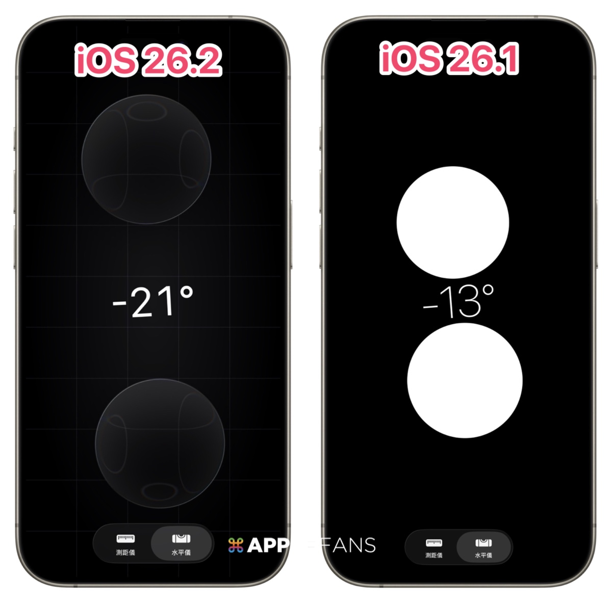 測距儀 App 裡面的水平儀,現在使用 Liquid Glass 風格,以兩個液態玻璃的氣泡取代白色圓點,讓整體視覺更現代、更柔和。