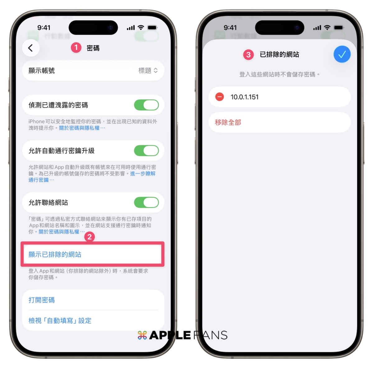 如果有些網站你不小心手殘讓 iPhone 不要自動儲存密碼,變成黑名單了怎麼辦?現在可以在「設定」> 密碼 App > 找到「顯示已排除的網站」裡自己排除黑名單。