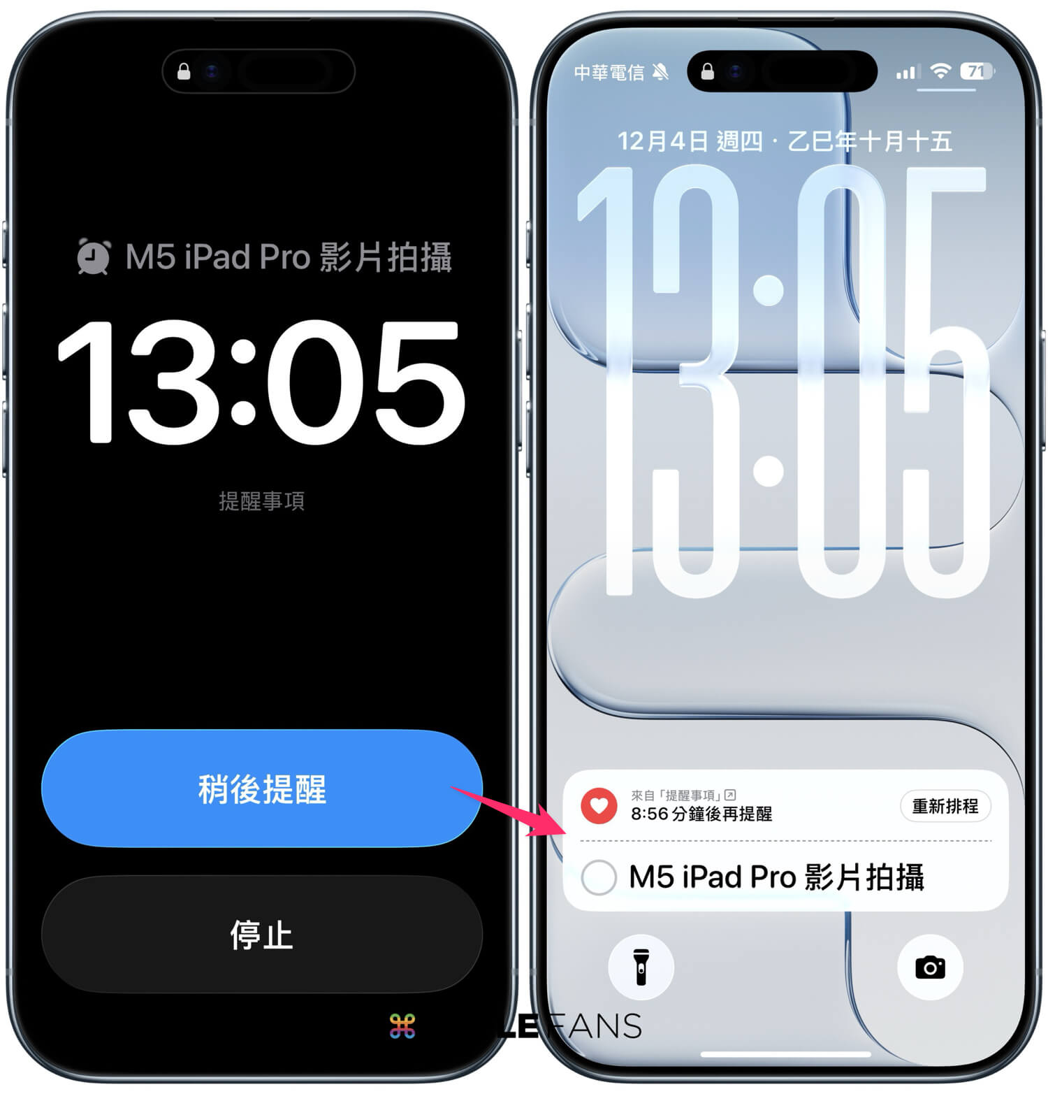 當提醒響起的時候,鎖定畫面會跳出一整片醒目的藍色畫面,來區分提醒鬧鐘與一般鬧鐘,一樣會有「稍後提醒」或「滑動以停止」的選項。如果你選了稍後提醒,螢幕上還會直接開始倒數,讓你一眼就知道還剩多久、要不要乾脆直接完成或改個時間。