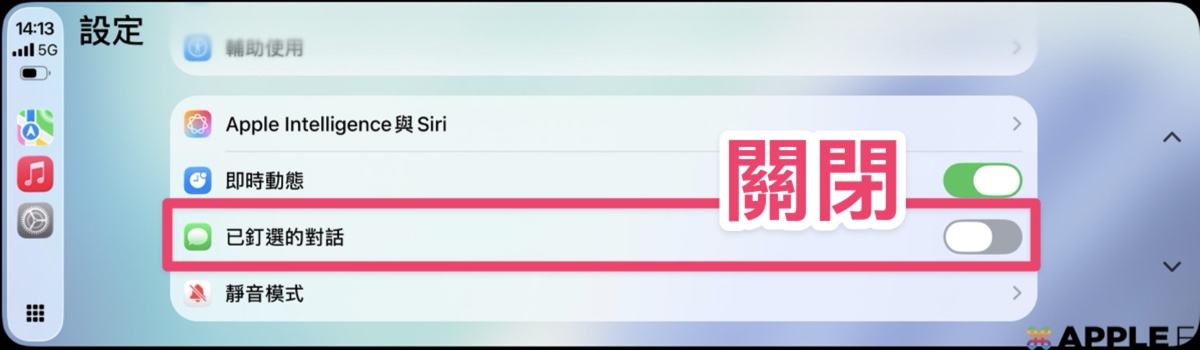 升級至 iOS 26.2 之後,在 CarPlay 的設定裡,終於新增了一個開關,讓你可以直接把「顯示釘選訊息」給關掉。