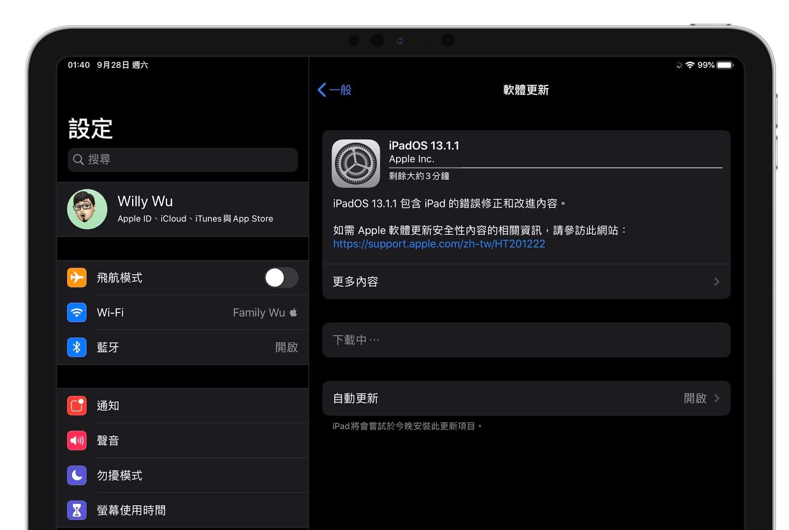 iPadOS 13.1.1 包含 iPad 的錯誤修正和改進內容。此更新項目: