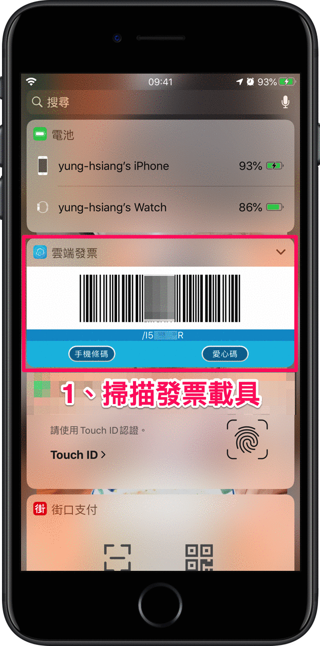 首先,鎖定畫面往右滑,給店員掃描先前介紹透過「雲端發票 app」製作的發票載具條碼,再按兩下 iPhone 按鍵啟用「錢包」功能,刷一次會員卡條碼,最後再進行 Apple Pay。