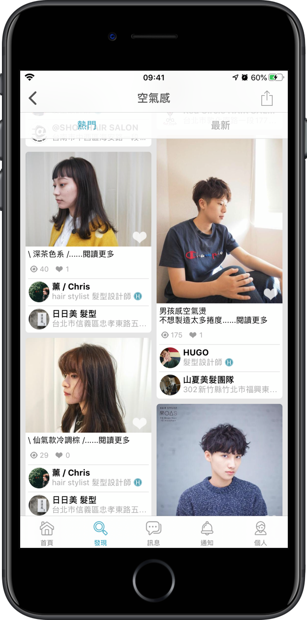 搜尋的結果非常清楚,可以看見許多相關的髮型成品照片,都是客人的實拍照(以後你做完了也可以登在上面!!)設計師的名稱和所屬工作室,而那些資訊主頁都能各自點進去查看更多作品或評價,資訊公開的感覺讓人感覺相當能信任。