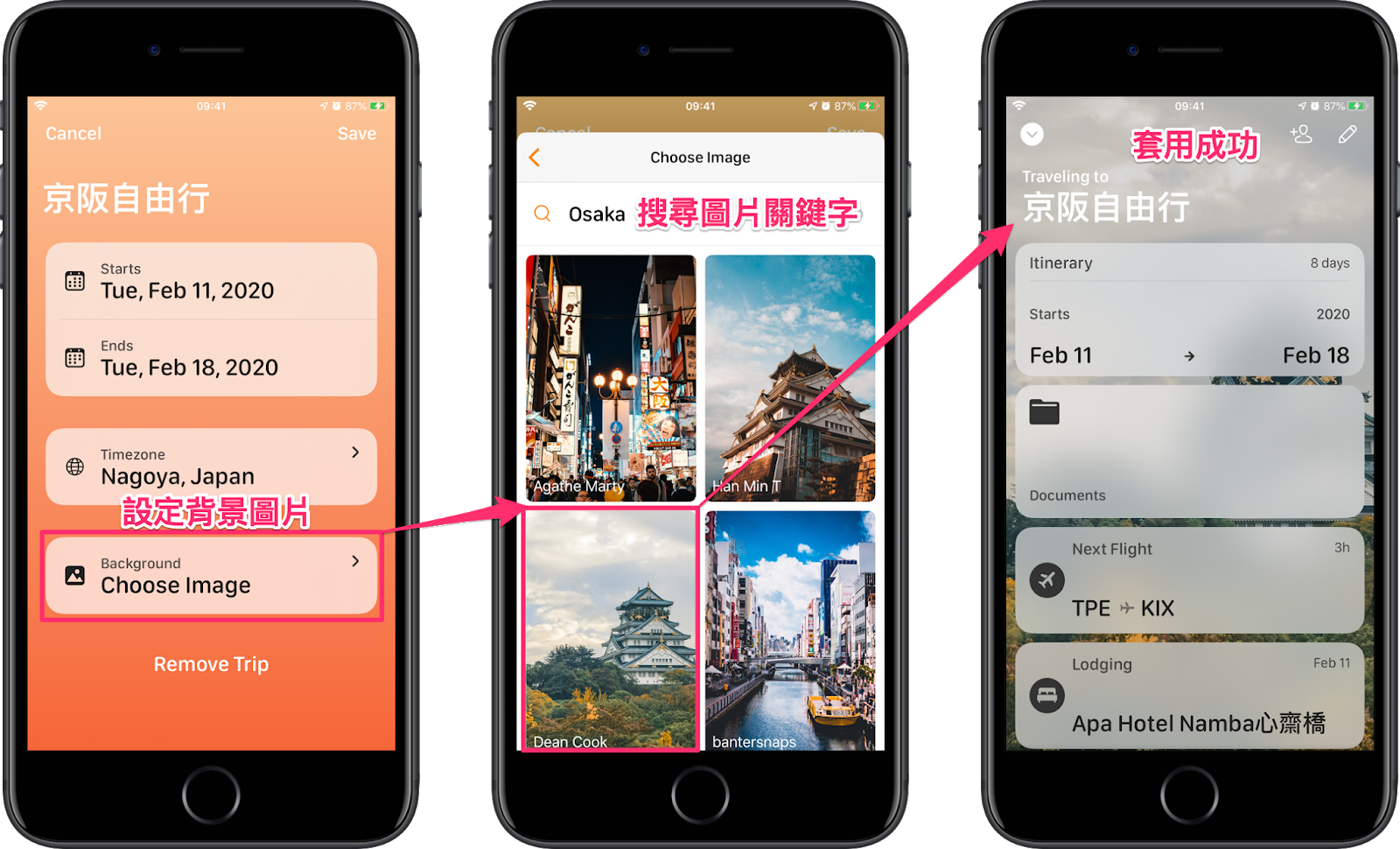 點選右上角的「編輯」按鈕後,進入設定起迄日期的畫面,點選最下方 “Choose Image” 按鈕,即可透過搜尋網路的方式抓取背景圖片(或使用自己手機內的照片),讓整個畫面換然一新,且和主題相符囉~