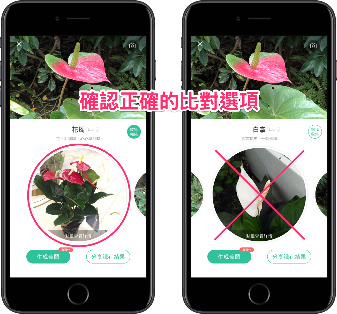 完成辨識之後,畫面就會出現各種相似的植物名稱和照片,讓你再次對照是否為正確的結果;小編試過幾次,大部分第一個結果就會正確的,重點在於必須將特徵拍清楚。