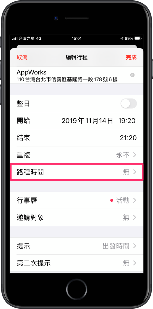 這是 iOS 行事曆內建的 路程時間 功能,與內建 Apple 地圖結合在一塊,是成功利用內建系統溝通的完美例子。