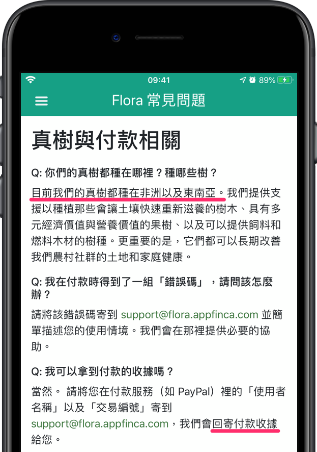 在 app 的「FAQs」頁面當中,可以閱讀 Flora 針對種樹綠化計劃的詳細說明,請大家再自行參考(本站不為該團隊之可信度負任何責任)。
