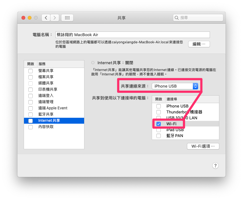 本站上次發表過一篇「把 Mac 變成 Wi-Fi 基地台」的教學,透過那篇介紹過的基本操作方式,在設定畫面中將網路來源改成 “iPhone USB”,並透過 “Wi-Fi” 分享出去,就可以打造出「(行動網路)iPhone – USB – Mac(Wi-Fi 訊號)」的網絡囉!