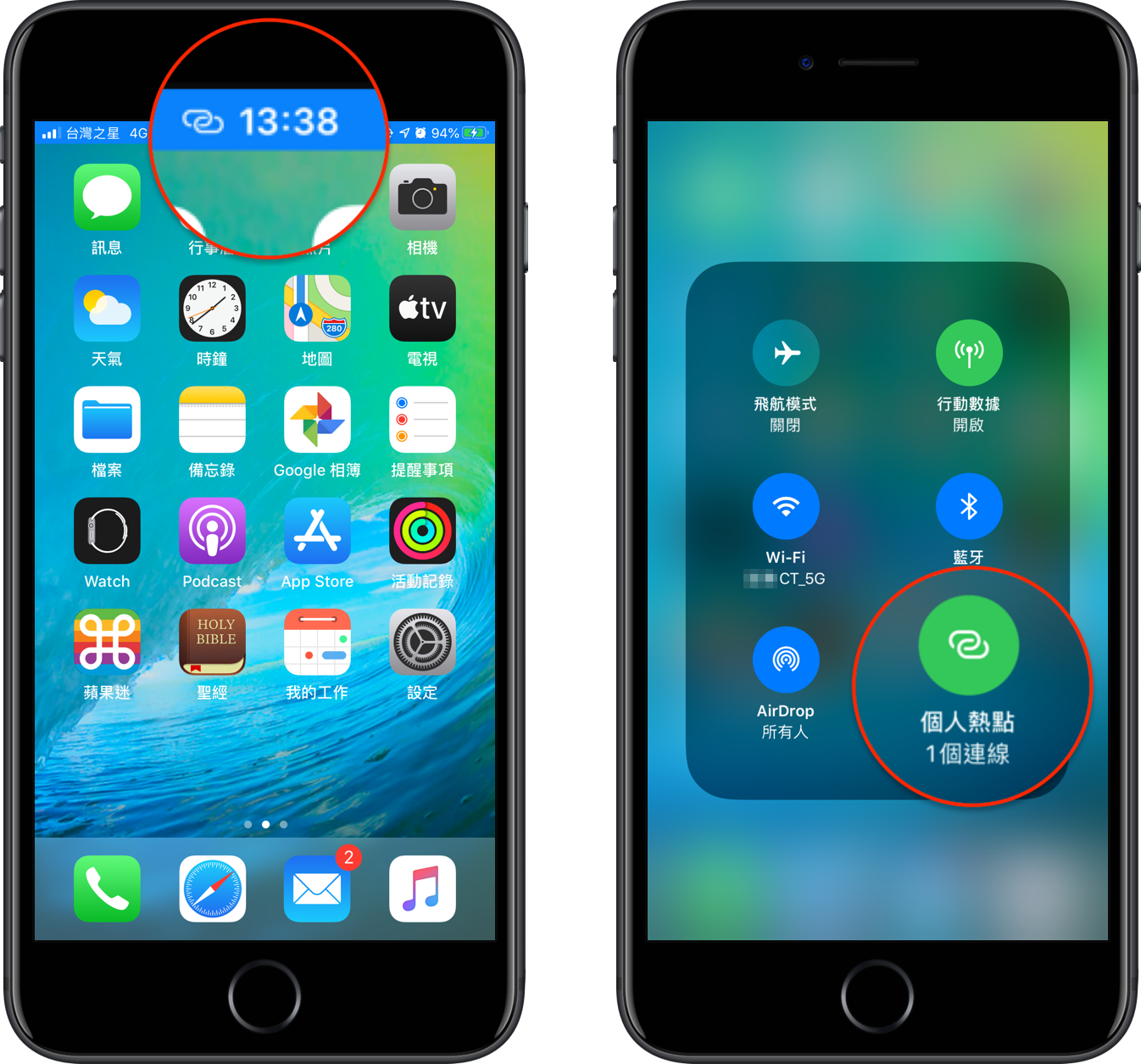 成功連接電腦後,iPhone 上方狀態列就會變成藍色,並顯示熱點圖示,這就代表電腦已經順利連上行動網路囉!