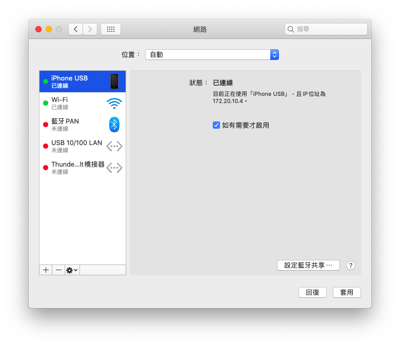 如果電腦沒有連上的話,點選「網路」設定畫面左下角的「+」按鈕,再新增一個 “iPhone USB” 網路,應該就會成功出現了。