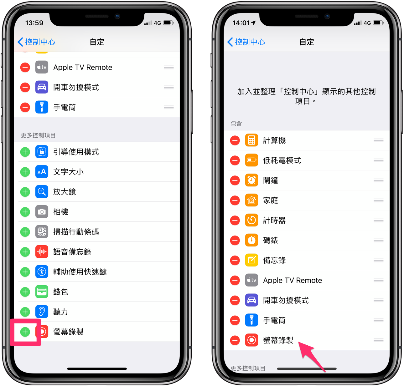 向上滑動往下找到「螢幕錄製」項目,並按下左方的【 】,就完成加入的設定囉。