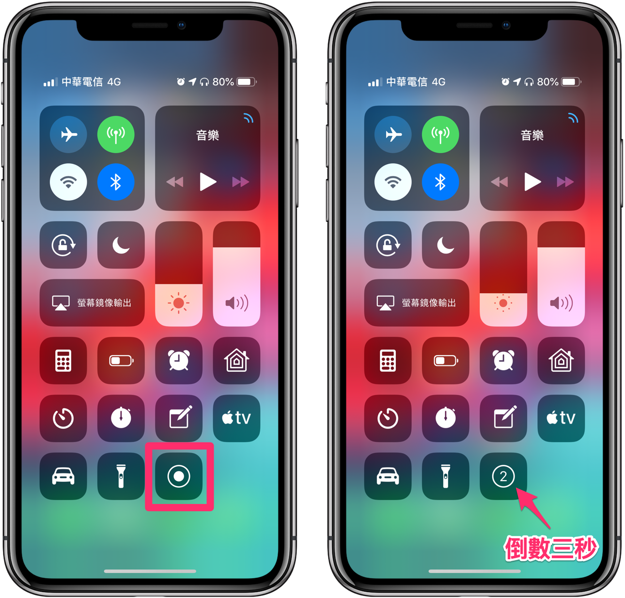 在控制中心下方會看到【 】,點下按鈕、出現倒數 3 秒的提示,之後螢幕錄影便開始囉!