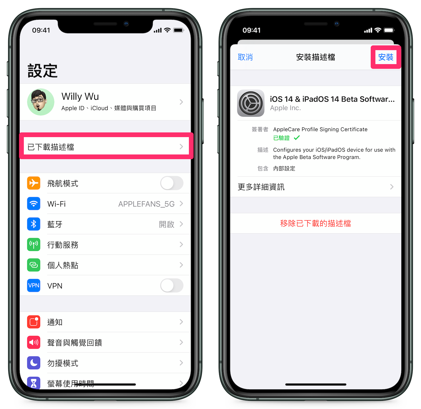 進入「設定」>【已下載描述檔】,接著點選【安裝】。