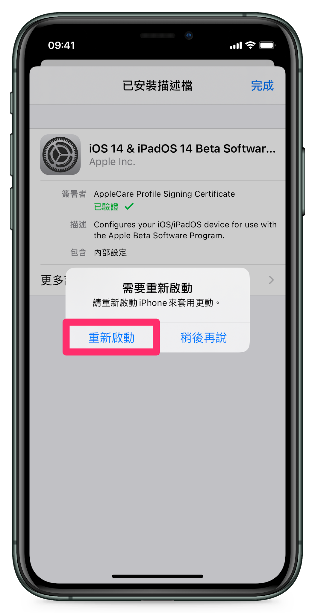 成功安裝描述檔後,系統會要求重新啟動裝置。