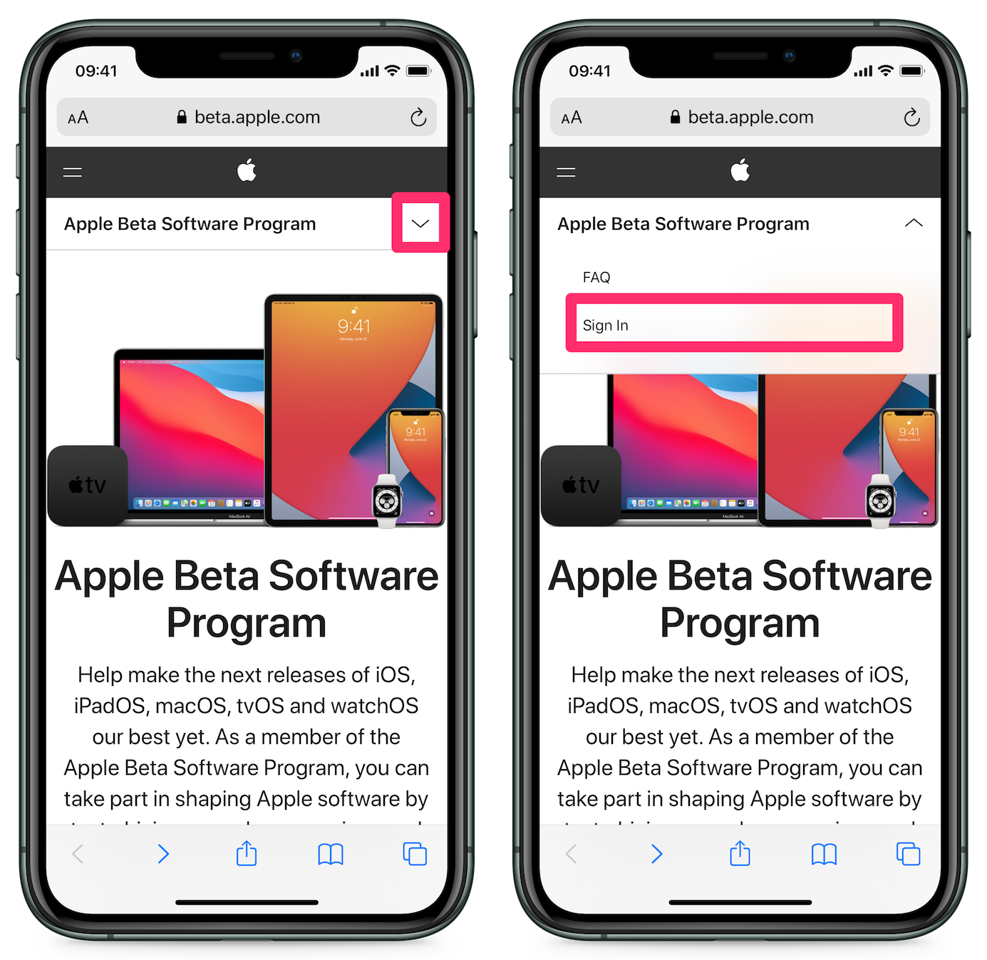 開啟 Safari,在進入 http://beta.apple.com(點此進入),進入 Apple Beta 版軟件計劃網頁,並按下右上角選單,再點選【Sign In】。