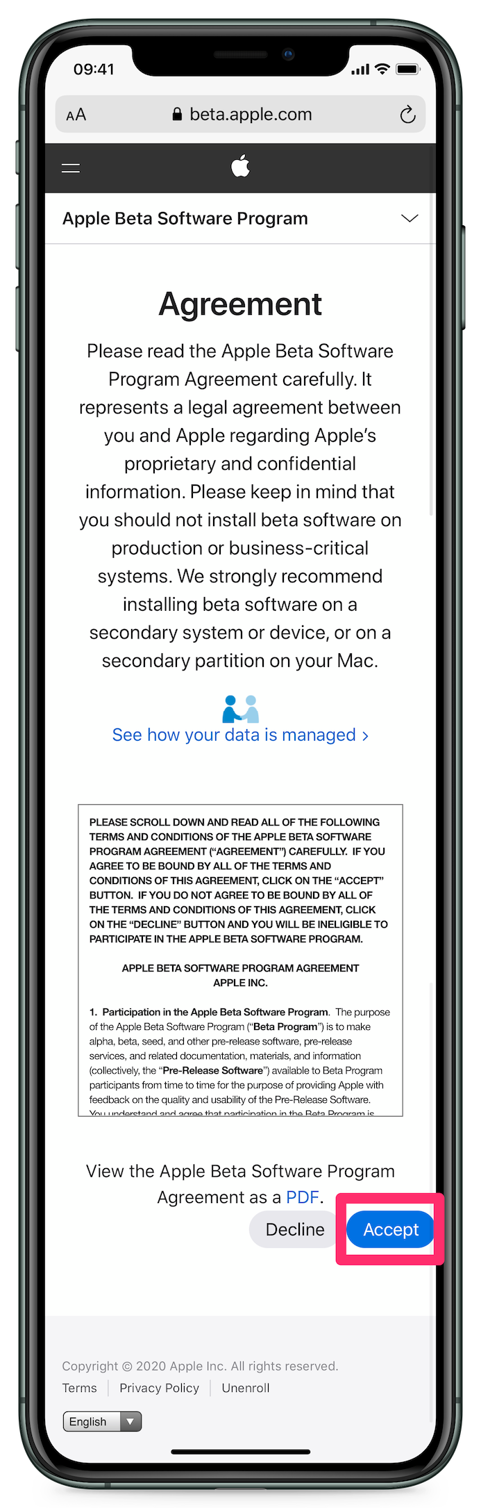 登入 iCloud 帳號後,往下拉,點擊【Accept】同意測試。