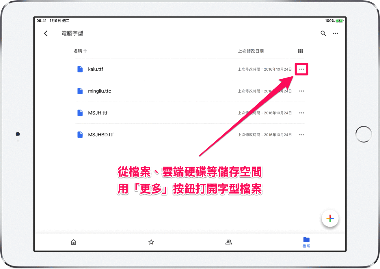 安裝步驟很簡單,只要先將電腦當中的字型先上傳到任何雲端硬碟當中,就可以拿起 iPad 打開 iFont 了;接下來的步驟請看下面的動圖: