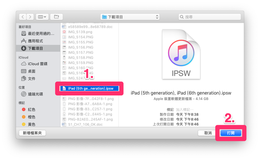在跳出的視窗中找到下載好的【IPSW 檔案】,點一下檔案並【打開】。