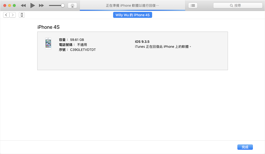 接下來 iTunes 就會開始幫 iPhone 4S 降級,大約 10 分鐘左右可以降級完成。