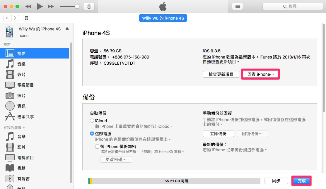 開啟 iTunes 接上 iPhone/iPad,按著鍵盤上的 option 鍵不放,同時點選 iTunes 上的【回復 iPhone…】按鈕。