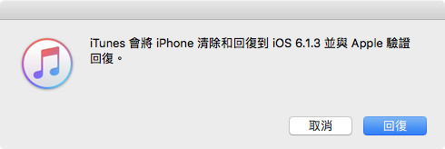 iTunes 會跳出視窗詢問是否確定要清除和回復到 iOS 6.1.3,請點擊【回復】來繼續下一步。