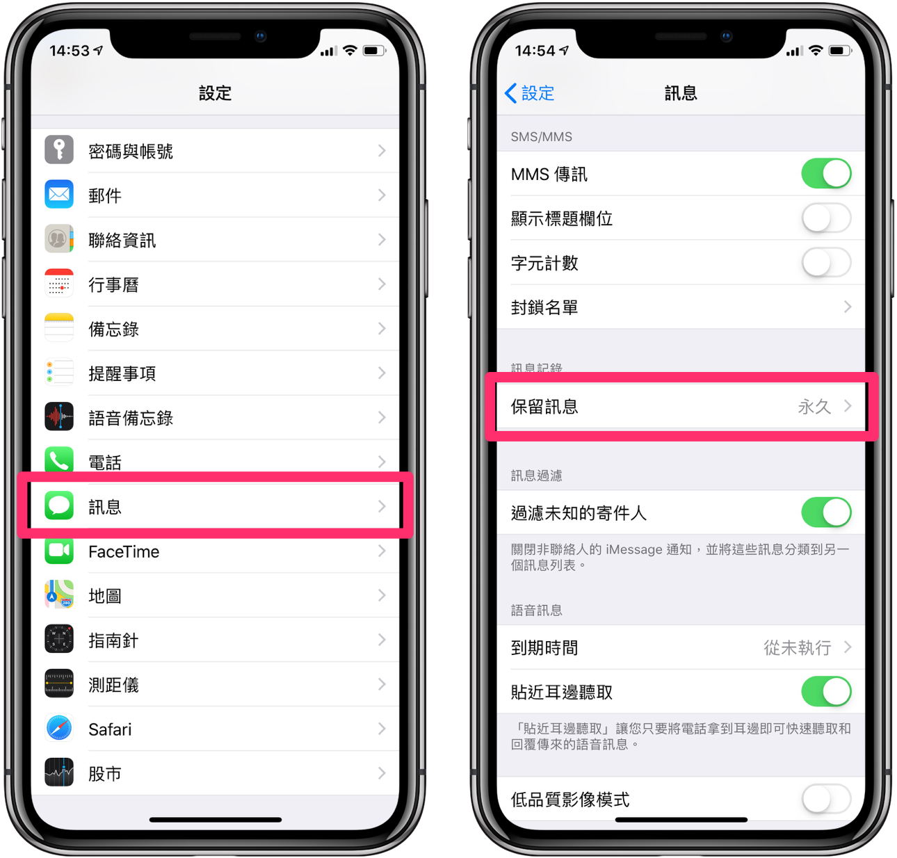 接著請確認訊息記錄的【保留訊息】設定為「永久」,否則可能一不小心所有訊息都會一秒消失⋯