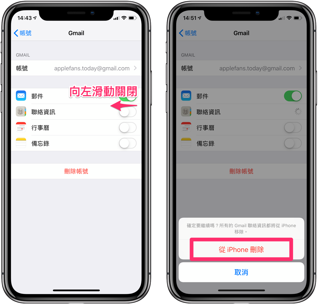 如果帳號原本「聯絡資訊」就已是「開啟」的狀態,此時請先向左滑動切換成【關閉】,然後在跳出的詢問視窗中選擇【從 iPhone 刪除】(別擔心,聯絡資訊還是安穩的躺在雲端)。