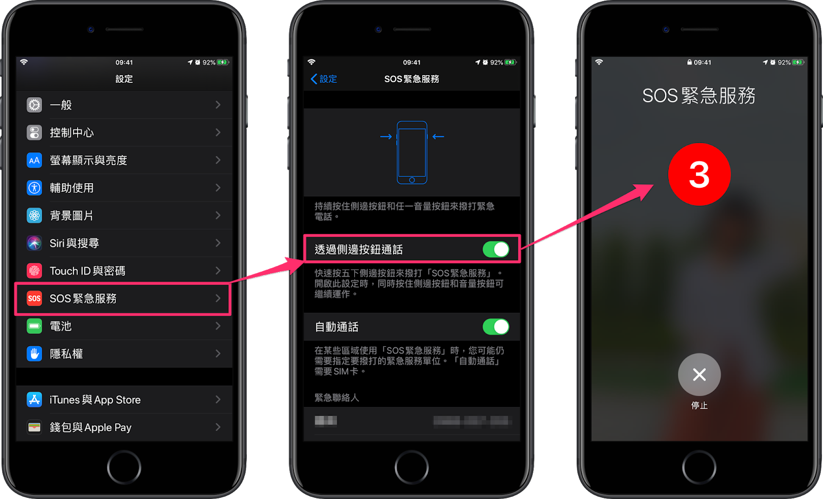 可以直接開啟「電話」撥打,或是透過設定「SOS 緊急服務」,連按電源鍵 5 次即自動撥出;SOS 功能會順便發送簡訊給所有設定的緊急聯絡人。