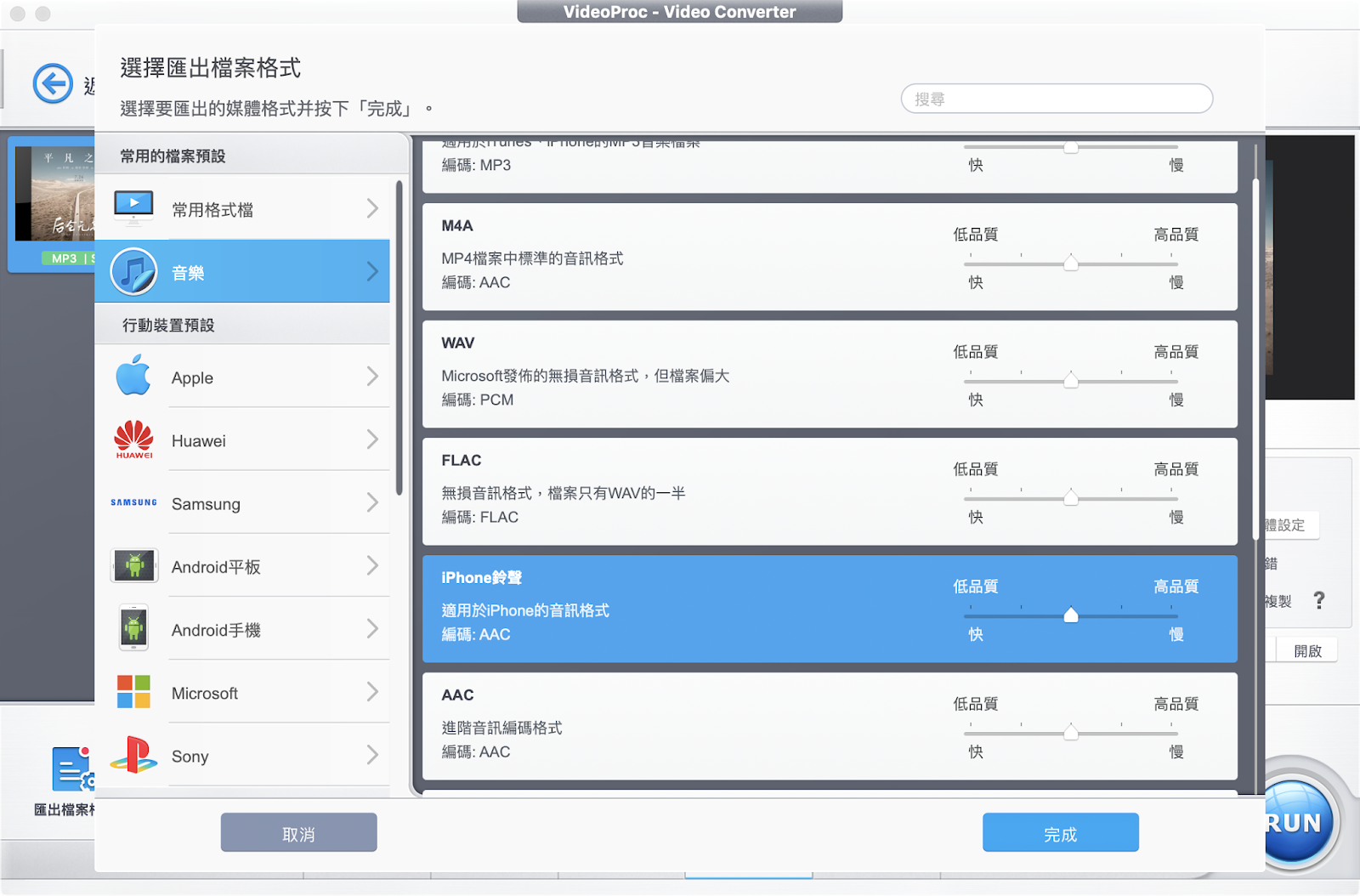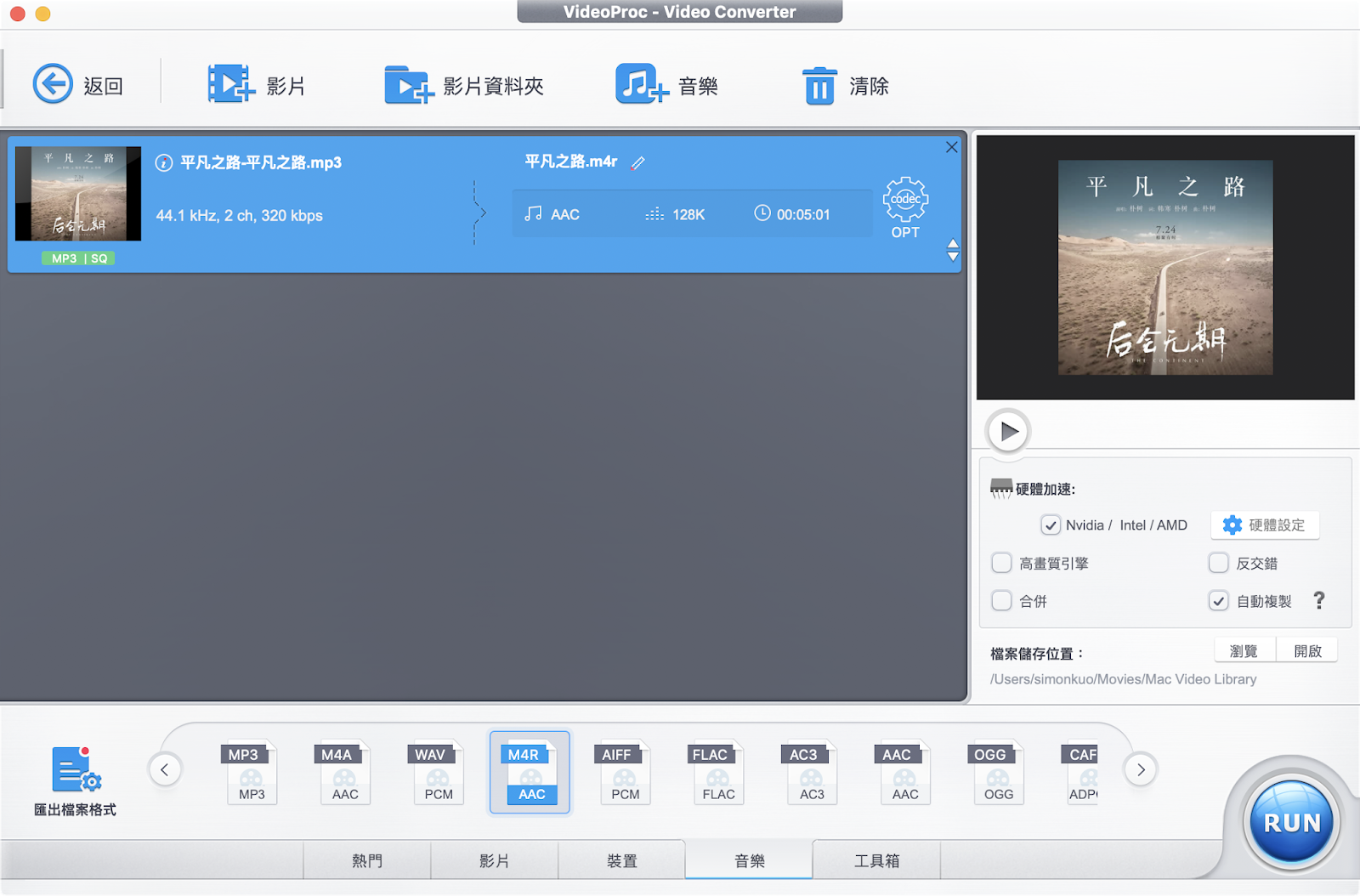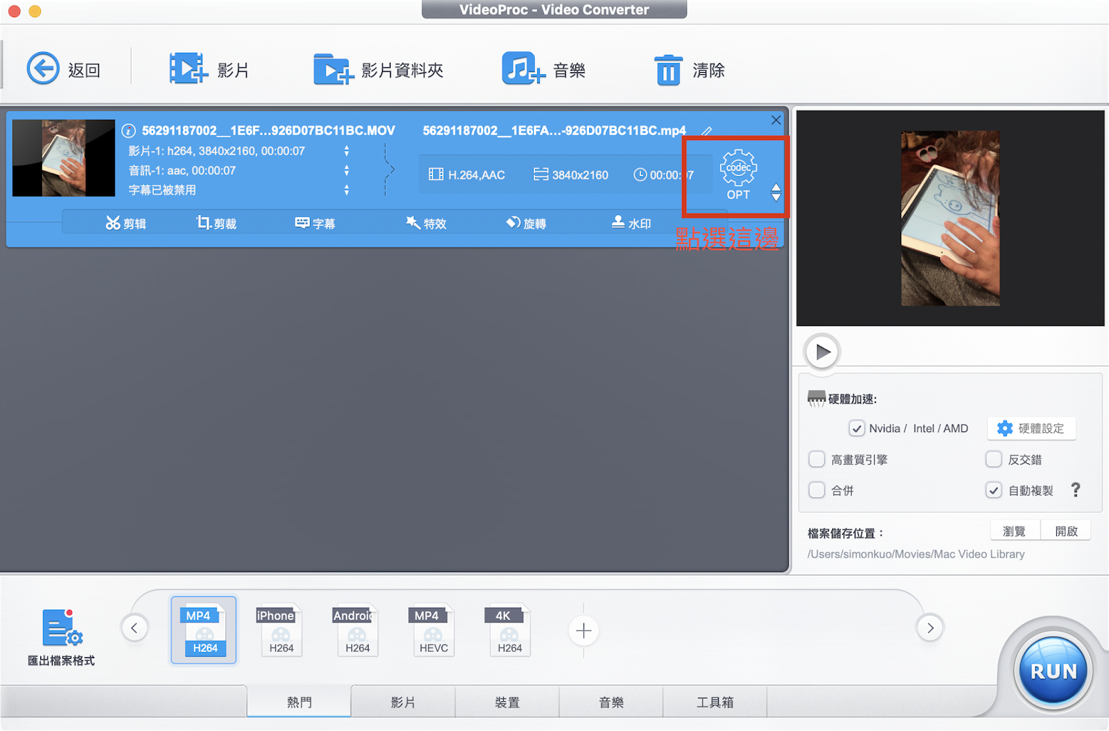 只要將影片檔案丟到 VideoProc 當中,並在右下角選擇想要的影片輸出格式,