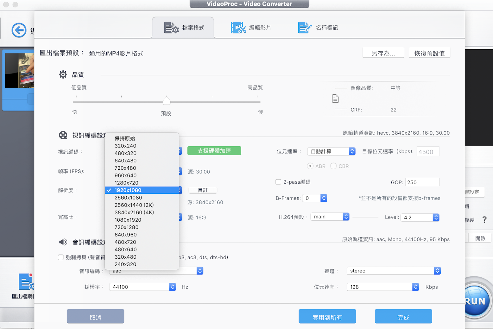 另外,只要進到影片的詳細內容設定當中,你還可以調整影片輸出的畫質。將 4K 的影片壓縮成 1080p 或是 720p 幫你節省不夠用的硬碟空間!