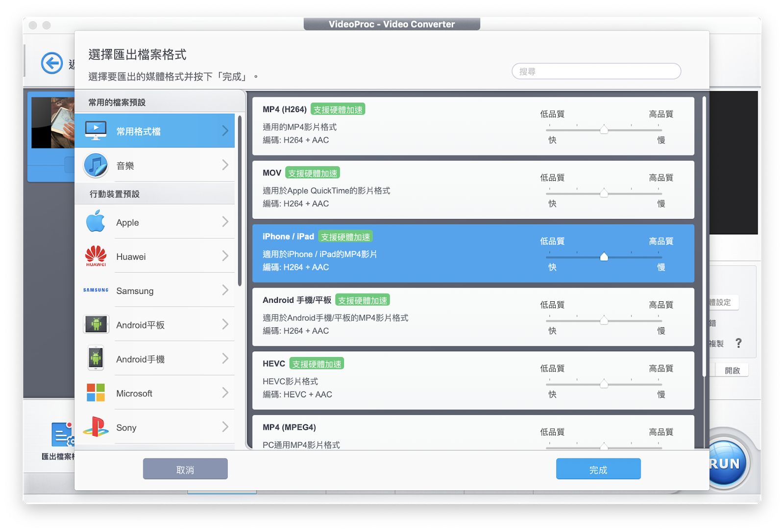若你所選擇的格式有標示「支援硬體加速」標誌就代表 VideoProc 能夠將你的電腦效能發揮到最高限度,用最快的速度進行轉檔。