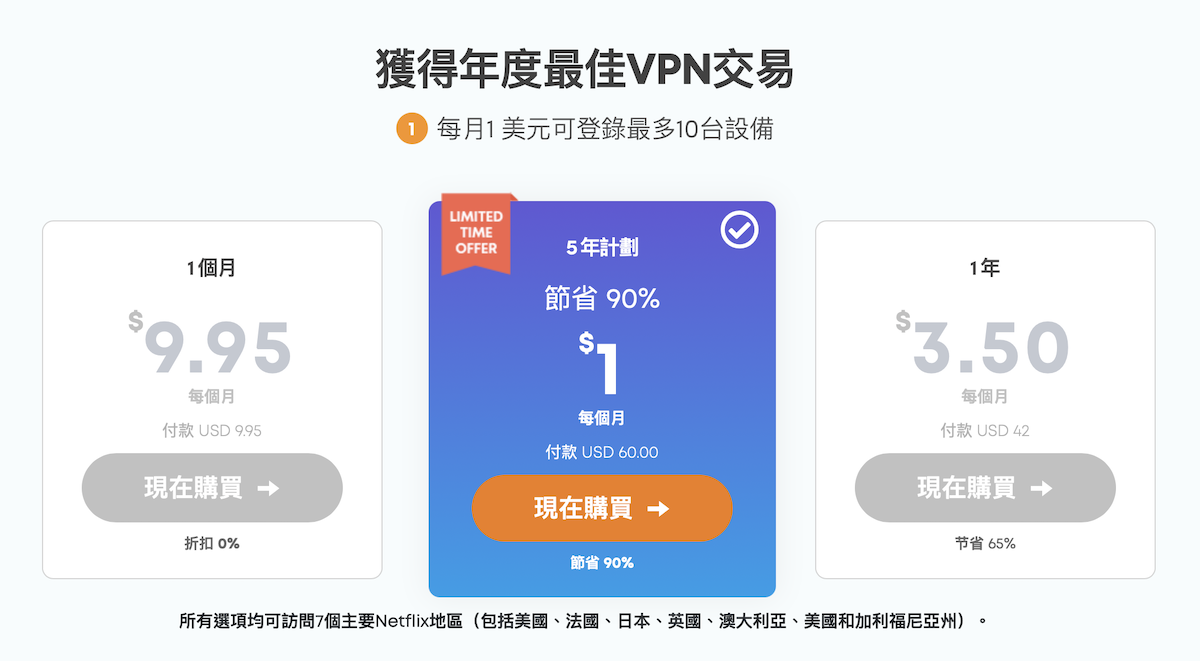 IvacyVPN 這次的活動價格大概是幾個有聽過大品牌中價格最低的,有著 90% off 的 1 折優惠,最低每個月花不到 30 元就可以多看超多 Netflix 影片,甚至還可以跨區到土耳其訂閱超便宜的 Netflix 家庭或是到印度訂閱超便宜的 YouTube Premium。