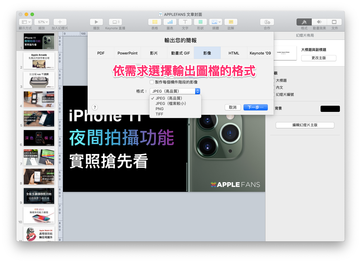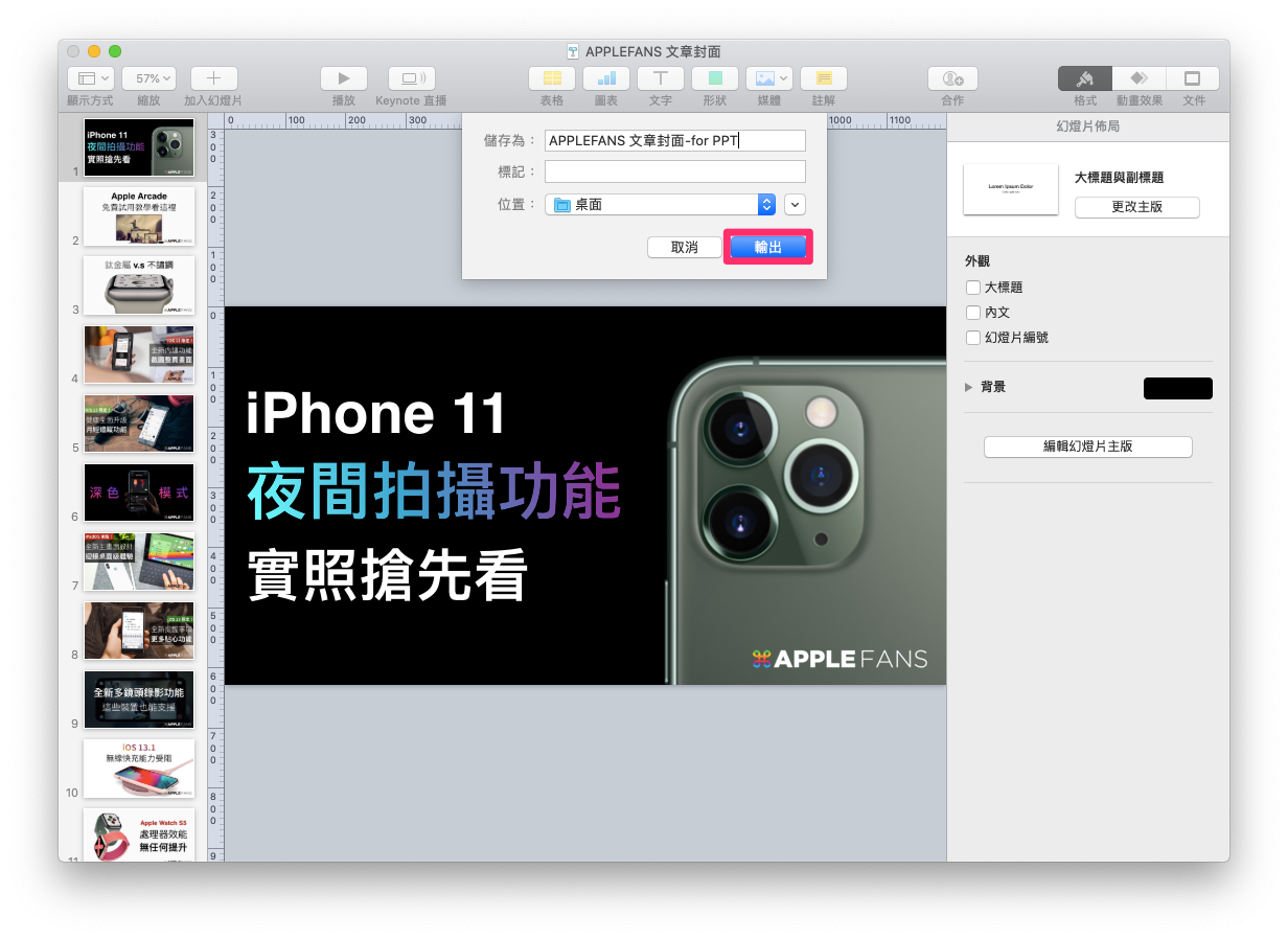 因此,接下來我們就利用這個方式,將原先用 Keynote 製作的精美簡報畫面全部輸出成圖檔吧~