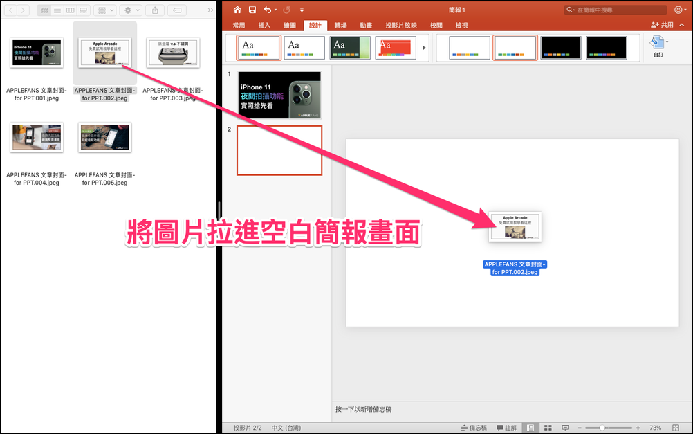 確認投影片尺寸正確之後,只要用游標一一將輸出的圖檔直接拉進空白畫面,就會自動填滿——如此一來,等於將 Keynote 畫面原封不動搬過來囉!