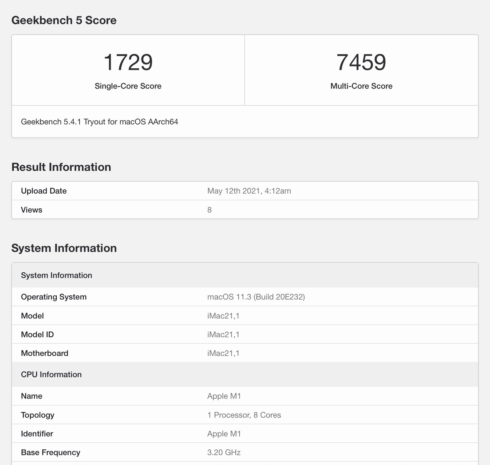 M1 iMac 跑分數據是針對 iMac 21,1 機型識別碼,它具有 8 核心 CPU、7 核心 GPU 和兩個 Thunderbolt 連接埠的入門級選擇。