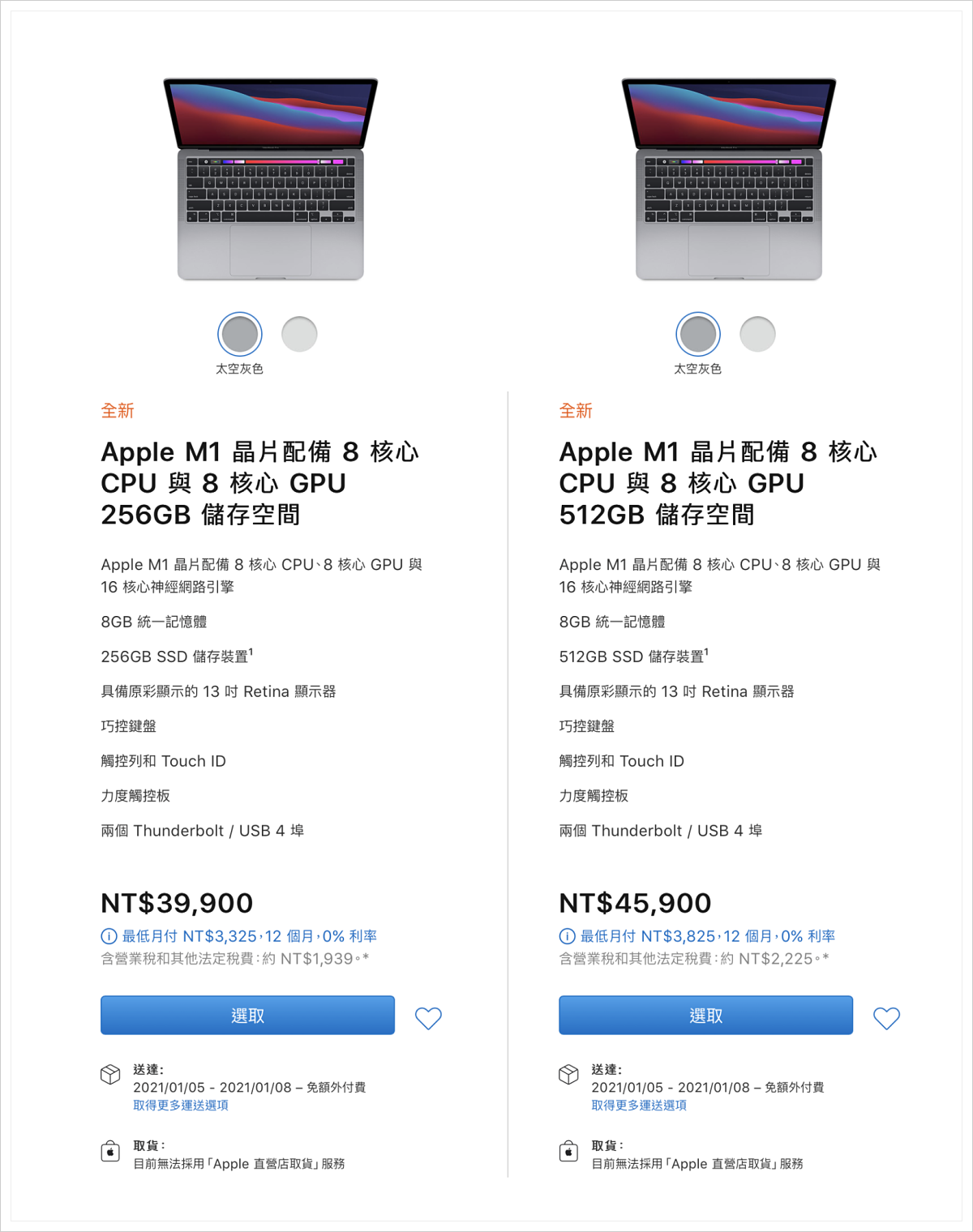 目前於官網下訂 MacBook Air 第一批最早將可以在 2021/01/04 收到商品,MacBoo Pro 與 Mac mini 則為 5 號,皆無法親自於直營店取貨,有需要的朋友就快去下單吧!