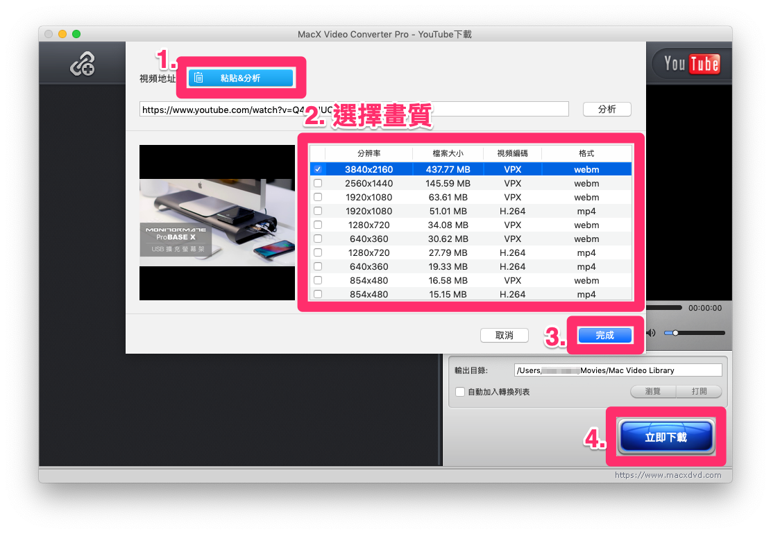 以 YouTube 為例,先複製想要下載影片的【YouTube 網址】,之後回到軟體的主畫面選擇【YouTube 連結】,然後按下【貼上 & 分析 】,再選擇想要的【解析度】,最後點一下【立即下載】即可。是不是非常容易呢?