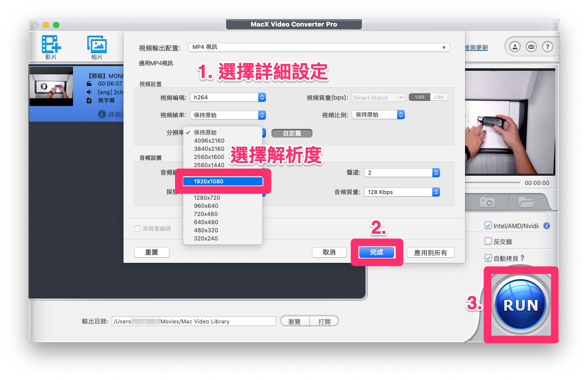 在這個畫面中,可以進一步選擇想要輸出的影片格式、解析度與其他相關細節設定,之後按下【完成】。