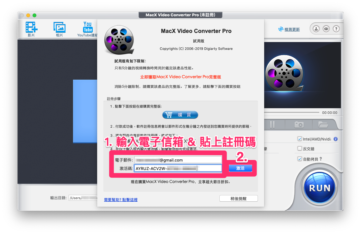 將軟體安裝開啟後,輸入你註冊的電子信箱、貼上註冊碼到畫面中的輸入匡、按下【激活】,就大功告成啦!
