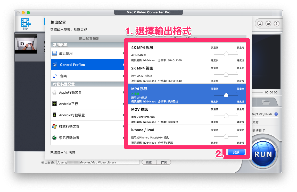 接著會跳轉進入轉檔格式選擇視窗,列出各種影片格式任君挑選;或是直接在「行動裝置配置」列表選擇想要使用影片的裝置類型,便會自動幫你使用預設的相容檔案格式,算是相當便捷的功能。選好後按下【完成】,進入下一個步驟。