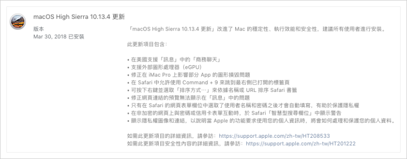 「macOS High Sierra 10.13.4 更新」改進了 Mac 的穩定性、執行效能及安全性,建議所有使用者進行安裝。