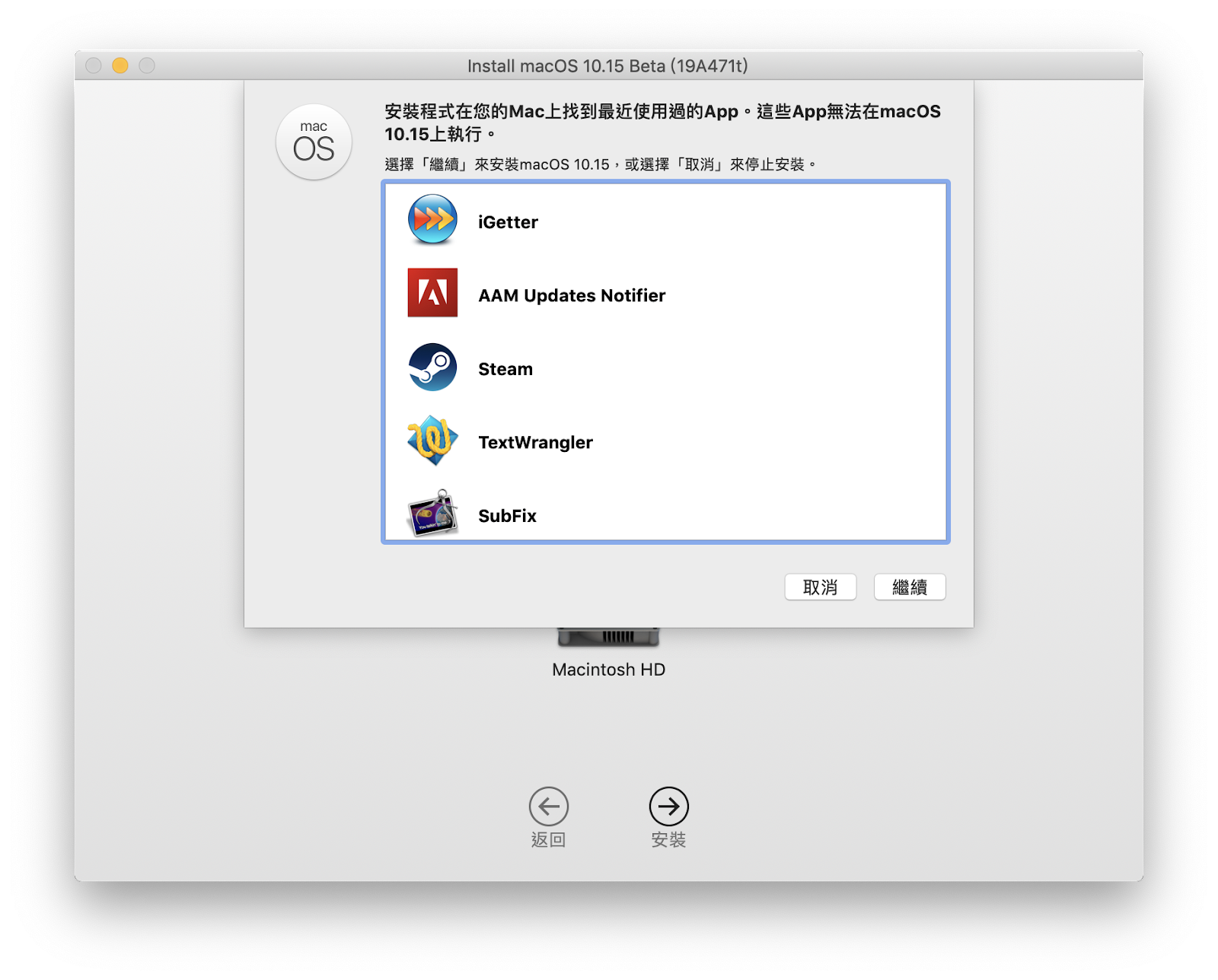 因為是全新的系統,所以 macOS 會提醒如果升級到 macOS 10.15 後,會有些 App 無法使,確認一下如果不能用這些 App 會否影響你日常生活的工作,不會的話,請按【繼續】進行下一步驟。