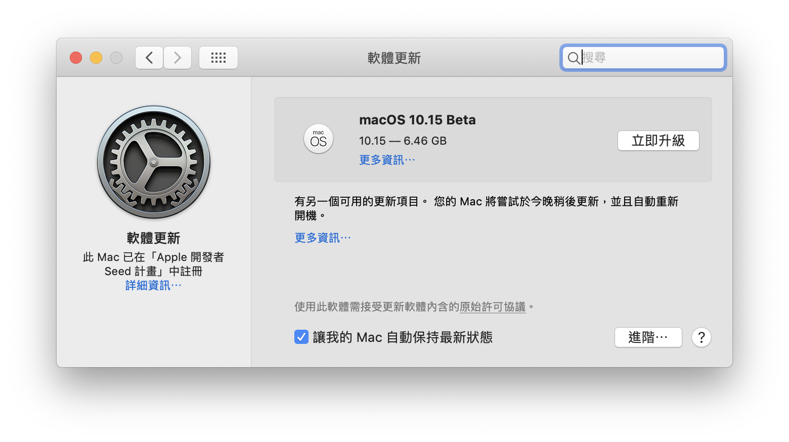 macOSDeveloperBetaAccessUtility.dmg 安裝完成後,進入「系統偏好設定」>「軟體更新」,就會出現可以升級的項目,請按下【立即升級】。