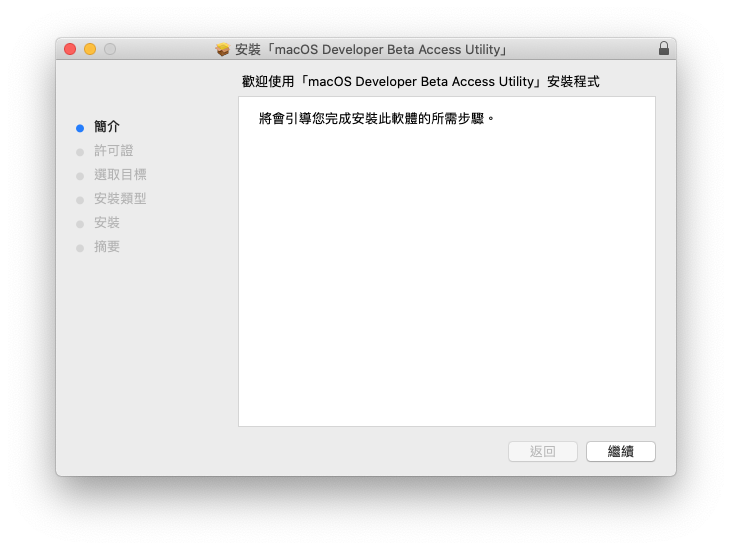 首先下載 macOSDeveloperBetaAccessUtility.dmg 檔,並安裝完成,才能加入開發者測試計畫來下載最新的 macOS 10.15 Beta。