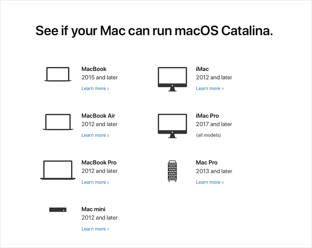 可以升級至 macOS 10.15 的設備這次集中在 2012 年後的機型,其中當然也支援最新發表的 Mac Pro,升級前請先瀏覽您的設備是否相容。