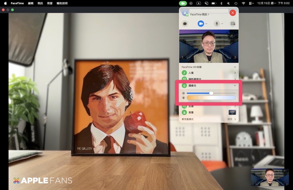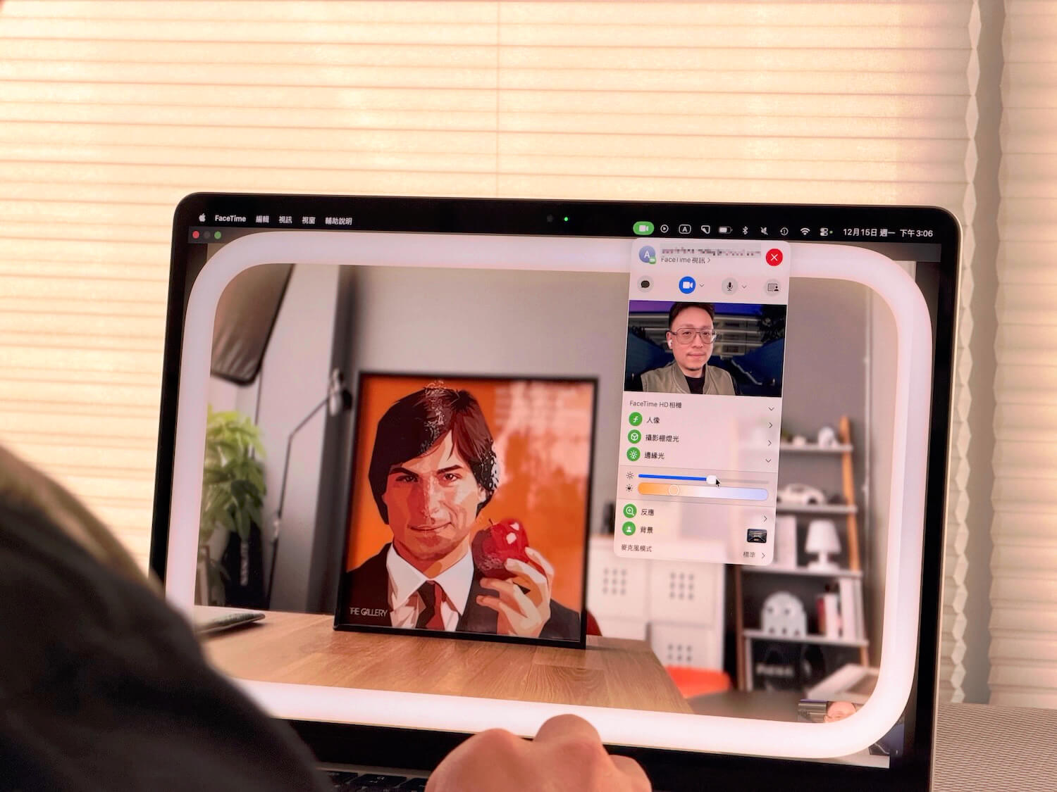 你可以在進行 FaceTime 或其他支援系統視訊功能的 App 時,點選上方選單列的「視訊效果」,就能看到相關補光選項。啟用後,還可以依照需求調整亮度與效果強度。這個功能並不是強制啟用,而是讓使用者自行決定是否開啟,彈性相當高。