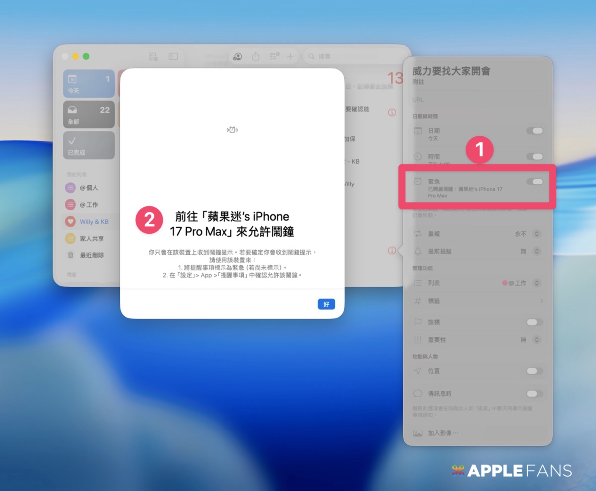 過去在 macOS 的「提醒事項」中,就算設定了時間,到點時多半只會跳出通知,很容易在忙碌時被忽略。而在 macOS 26.2 更新後,提醒事項正式加入「鬧鐘式提醒」的支援,當設定的時間到達時,系統會像鬧鐘一樣發出聲響,提醒效果明顯提升。
