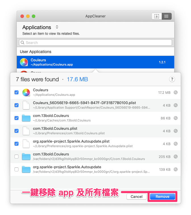 點選 app 圖示,就會看見 AppCleaner 很厲害地幫你把這款 app 藏在電腦裡面的所有相關檔案都抓出來,不只是圖示本身而已呢!