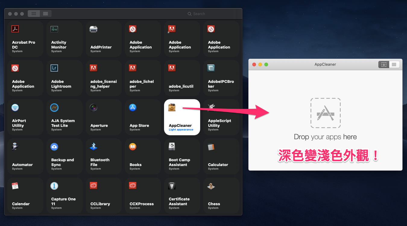例如,你可以指定第三方程式 AppCleaner 在深色模式下仍以淺色模式呈現—無論以後電腦切換為深淺色模式,都一樣會以淺色顯示,不因切換而變動。